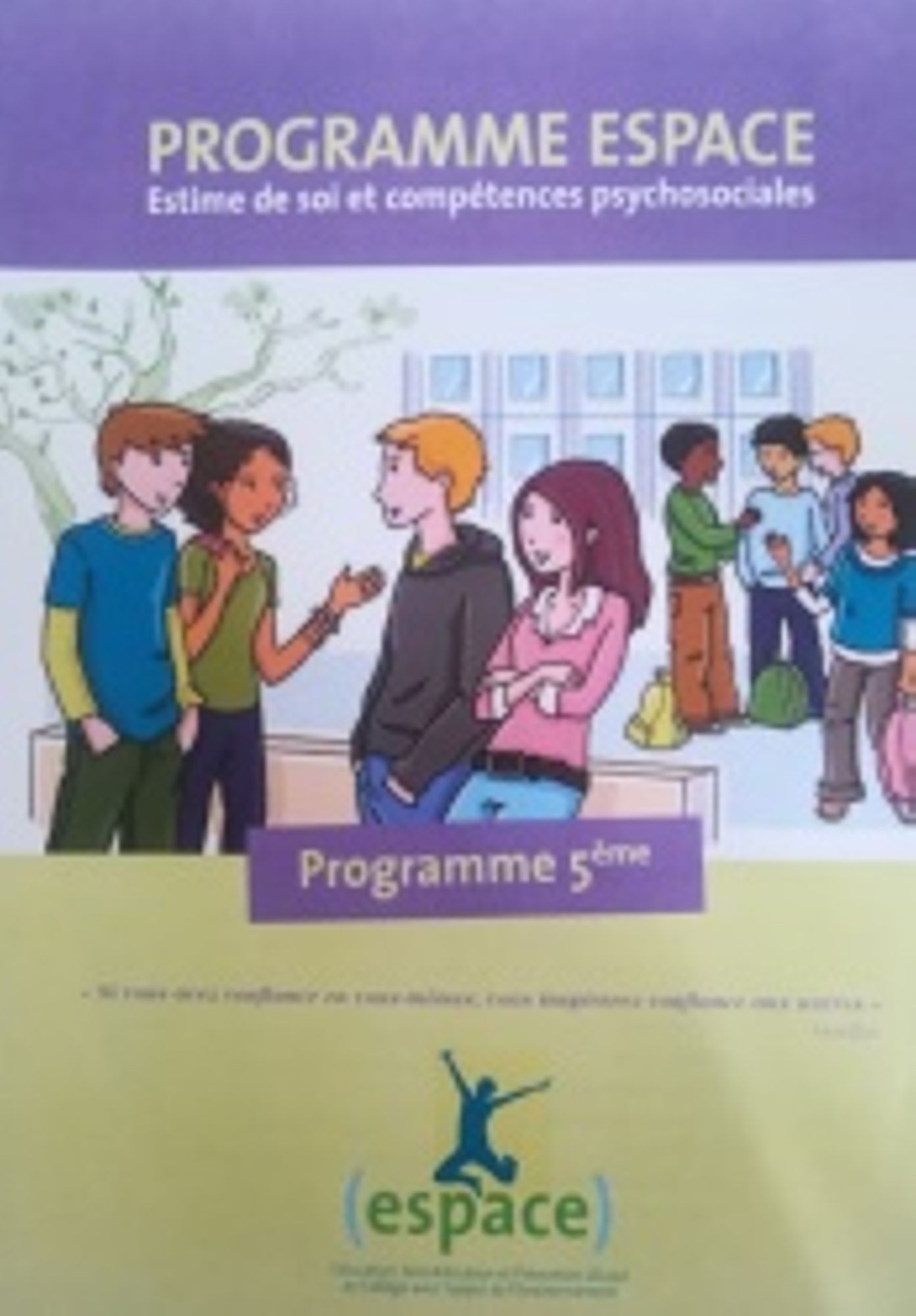 Le programme ESPACE (Education, Sensibilisation et Prévention Alcool au Collège avec l'appui de l'Environnement) propose des modules pédagogiques autour de l'estime de soi et des compétences psychosociales. Après une introduction théorique sur les émotions, l'auto-efficacité et la résolution de problème et de conflit, six séquences sont proposées : Comment ça va ? (réflexion sur les rapports entre la santé et la confiance en soi) ; Je (re)connais mes émotions (Identifier les principales émotions, en définir les signes extérieurs, les causes, les rôles) ; Je construis mon bien-être (mêmes objectifs que la séquence 2) ; J'apprivoise mes émotions (augmenter le sentiment d'auto-efficacité par la découverte de talents du quotidien) ; Je suis doué (améliorer ses capacités à trouver des solutions aux problèmes/conflits du quotidien) ; Je sais trouver des solutions (même objectif que séquence 5). Chaque séquence est accompagnée d'une fiche enseignant.