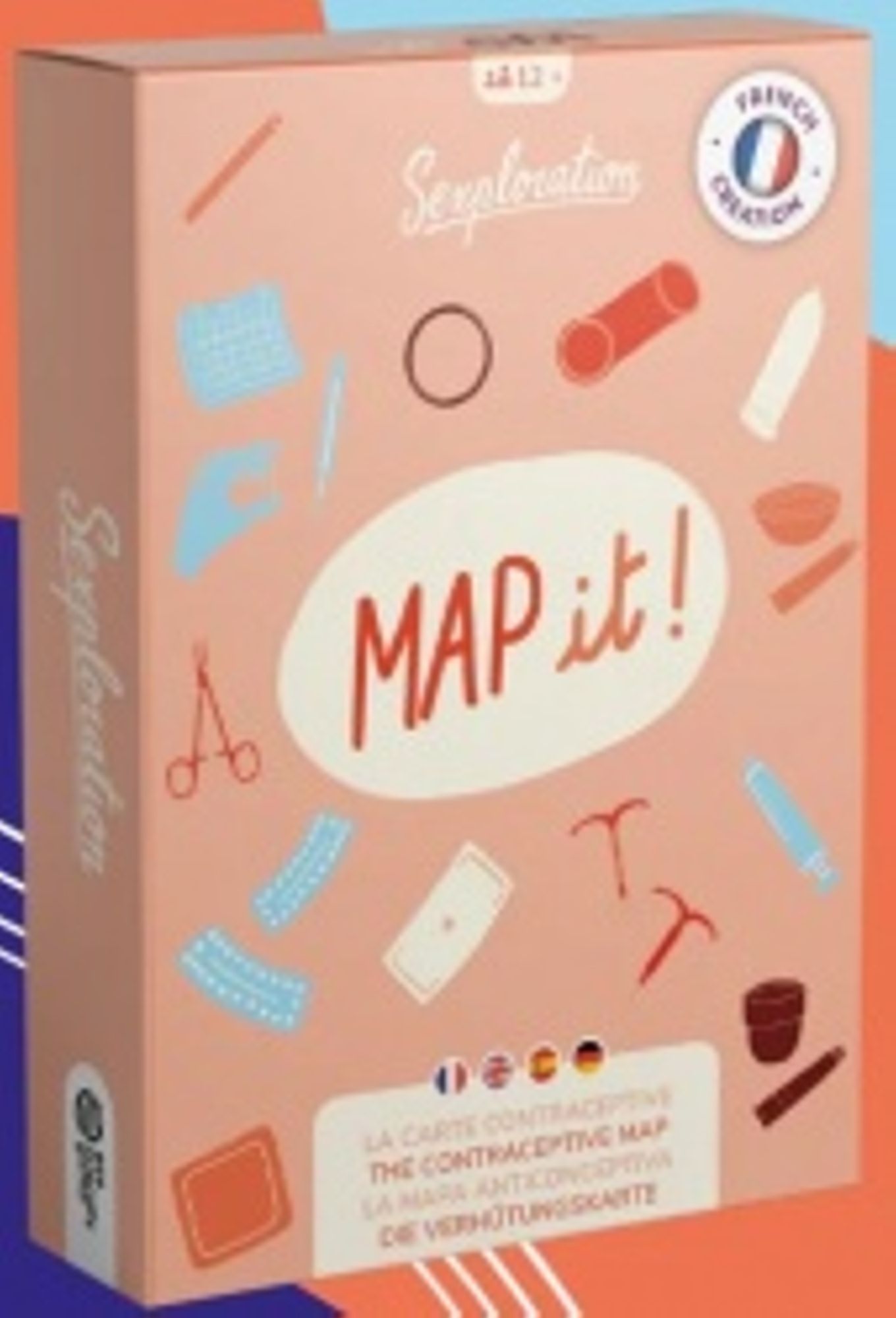Le jeu MAP it ! - La carte contraceptive fait partie de la série d'outils d'intervention Sexploration. Ce jeu de cartes permet de rappeler les connaissances relatives aux modes de contraception. Au recto des 13 cartes sont illustrés les différents modes de contraception, au verso sont précisés l'efficacité de la contraception, sa fréquence d'utilisation et des informations générales. Après avoir piocher une carte, le participant doit la replacer sur la silhouette "personne à vulve" ou "personne à pénis" et donner un maximum d'information qu'elle connait sur le contraceptif. Le jeu peut se jouer seul ou à plusieurs.