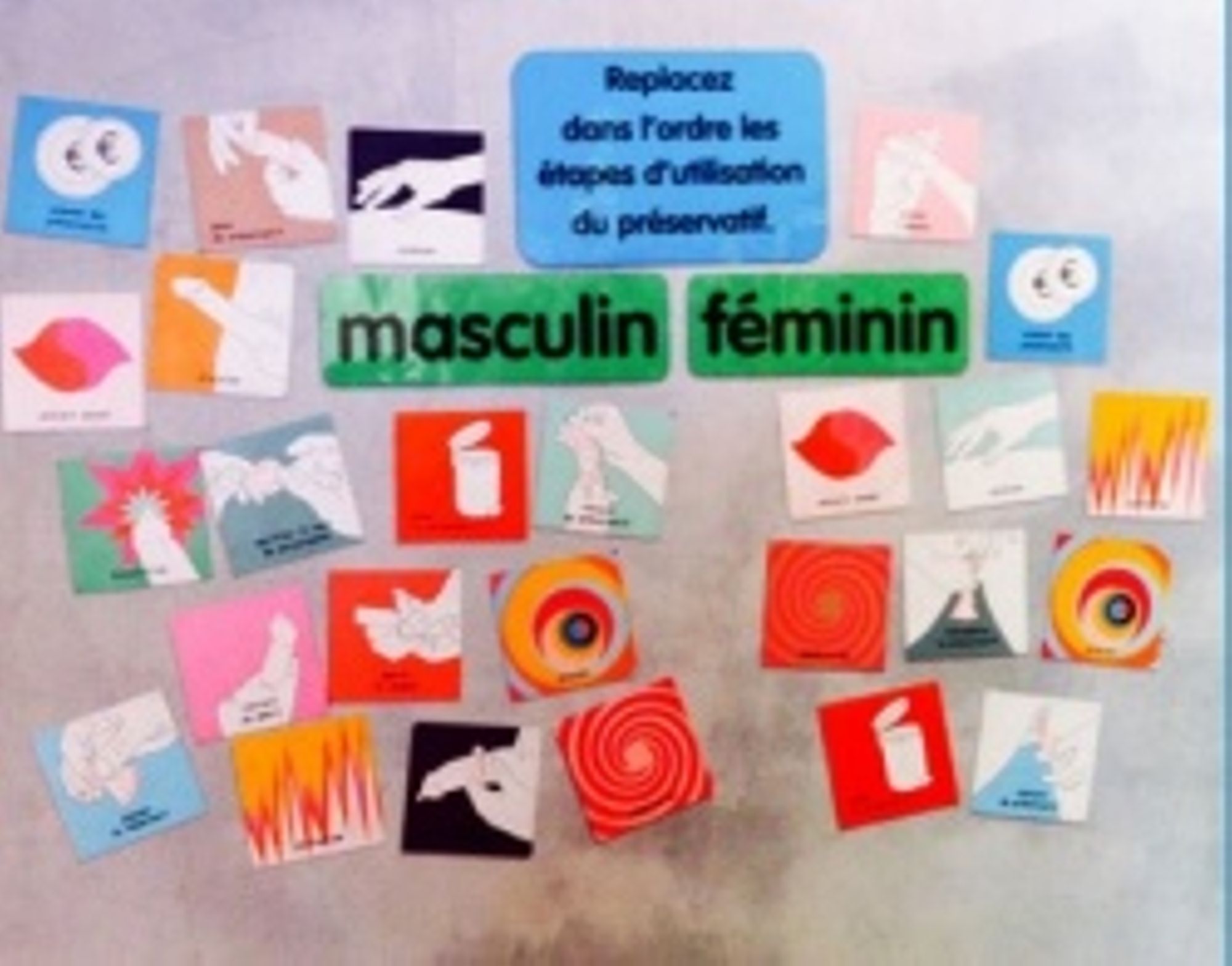 Ce jeu de cartes propose au participant de mettre dans l'ordre des cartes illustrées sur les étapes d'un rapport sexuel et les étapes de pose du préservatif masculin et féminin. Au cours de l’animation, les participants identifient les différentes étapes de pose du préservatif masculin et féminin, prennent conscience de l’intérêt de l’usage du préservatif dans la prévention des Infections sexuellement transmissibles (IST) et des grossesses non planifiées, et développent un esprit critique à propos des normes liées au rapport sexuel. les thèmes abordés sont le VIH et les IST, les stratégies de prévention, les relations affectives, amoureuses et sexuelles, la grossesse, la contraception et la parentalité.