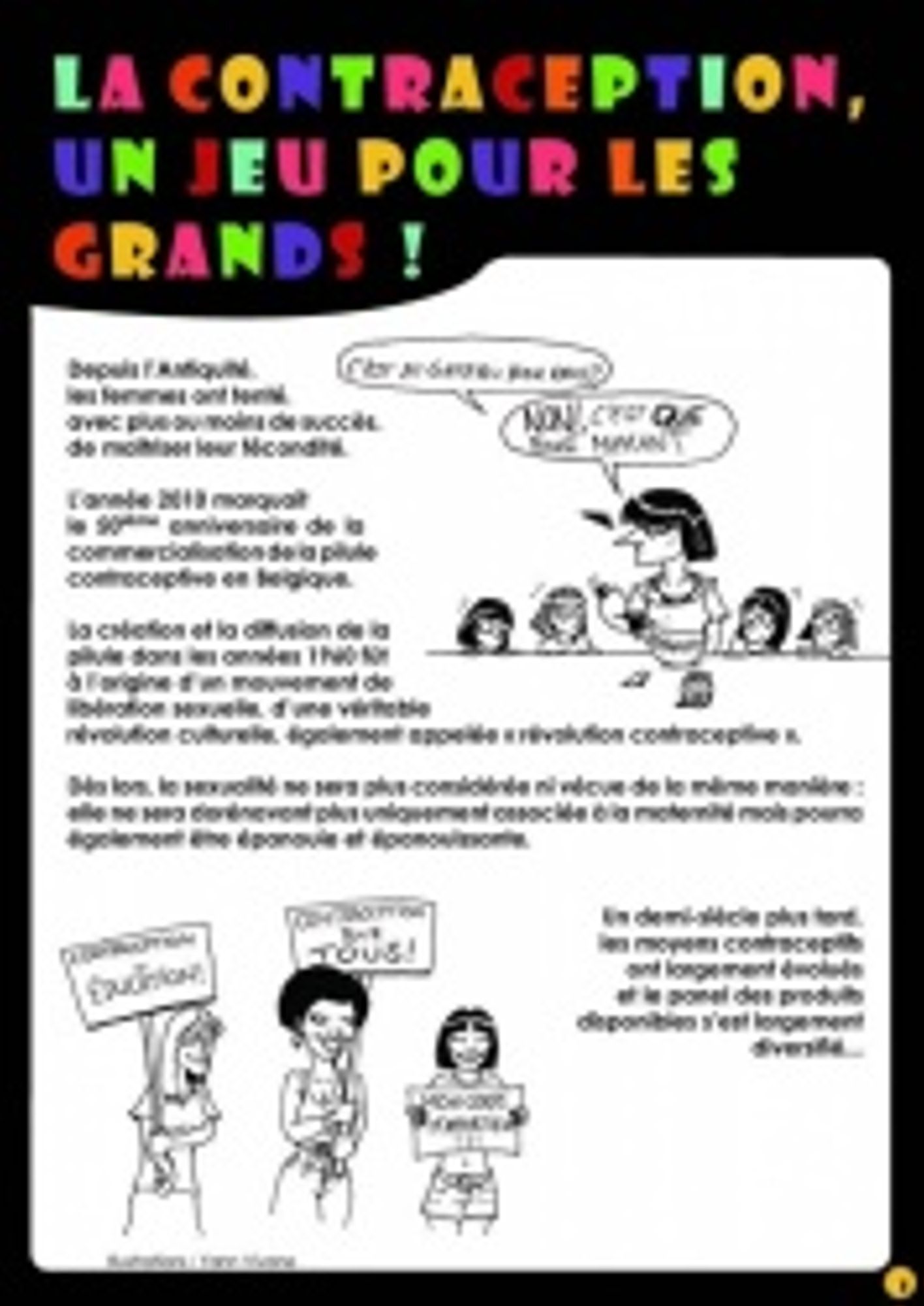 Cet outil est destiné à aborder la contraception avec des adultes et des jeunes à partir de 14 ans lors d'animations de groupe. Il a pour objectifs : de découvrir et/ou de vérifier les connaissances sur les différents moyens de contraception existants ; de permettre un choix en matière de contraception ; de favoriser l’autonomie des femmes par la maîtrise de leur fécondité et, par conséquent, de réduire le nombre de grossesses non planifiées ; de transmettre l’idée que la contraception est une affaire de couple (que les hommes sont également concernés par la question) ; d'aborder les IST (Infections Sexuellement Transmissibles), leur transmission et les manières de s’en protéger. Les différentes animations s'articulent autour de cartes illustrées, de cartes textes et de fiches indices qui reprennent les informations essentielles sur les différents moyens de contraception et autres sujets liés au thème. Des fiches pédagogiques offrent à l'intervenant les différentes pistes d'utilisation possibles de ces supports.