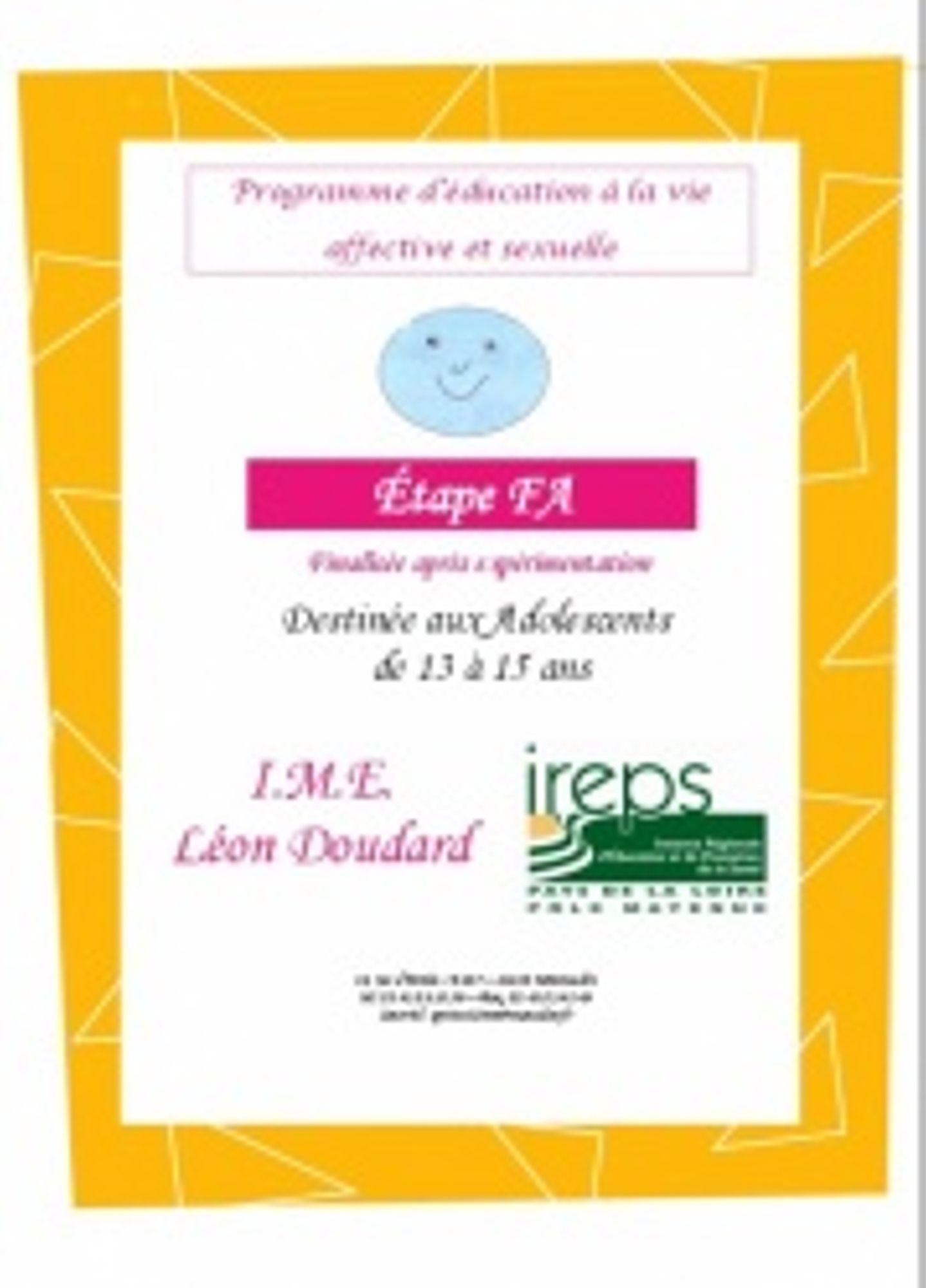 Ce PEVAS (Programme d'Éducation à la Vie Affective et Sexuelle) à destination des enfants et adolescents est constitué de 4 étapes. Chaque étape comporte un ensemble de 10 ou 11 séances éducatives de 1 heure environ qui permet d’accompagner l’enfant puis l’adolescent accueillis en IME (Institut médico-éducatif) dans l’exploration des différents aspects de la vie affective et sexuelle. L'étape Fa aborde : les différentes étapes de la vie ; les générations ; les changements corporels et les changements dans la tête chez le garçon et la fille au moment de l’adolescence ; la notion d’intimité ; les différents types de relations plus ou moins intimes et les différences en fonction du lien. L'étape Sol aborde : les différences entre les sentiments d’amitiés et amoureux ; la relation amoureuse ; le plaisir en général et le plaisir sexuel (masturbation) ; le plaisir à deux et la relation sexuelle ; la conception ; la grossesse ; les choix de vie ; les différents moyens de contraception et la visite au centre de planification.