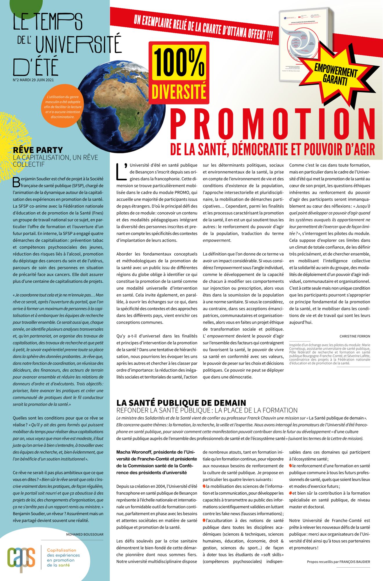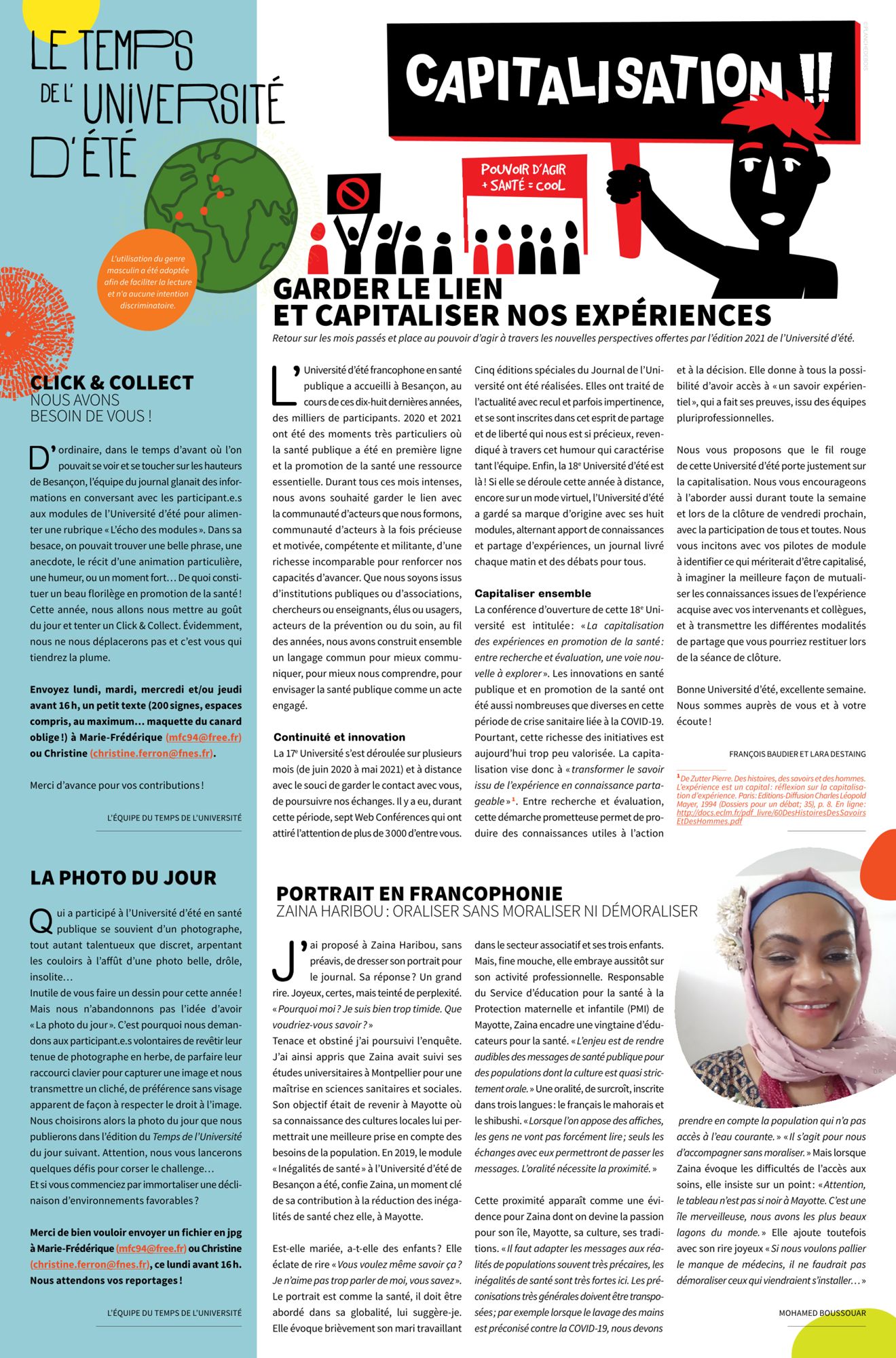 La 18ème Université d'été francophone en santé publique de Besançon s'est tenue en distanciel du 28 juin au 2 juillet 2021. A cette occasion, 5 numéros du journal Le Temps de l'Université ont été publiés.