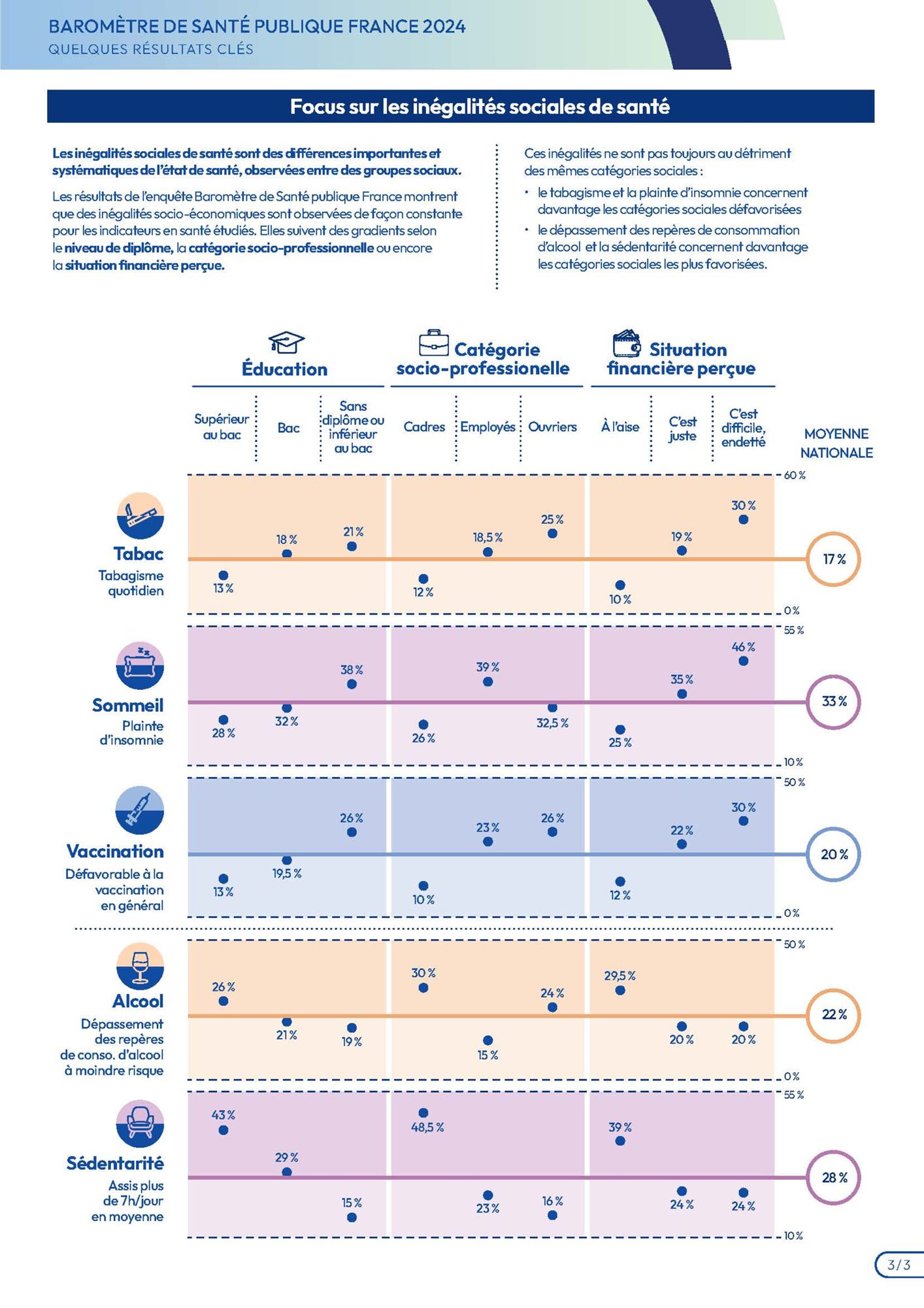 Le tabagisme et l’insuffisance d’activité physique concernent davantage les catégories sociales défavorisées alors que le dépassement des repères de consommation d’alcool à moindre risque et la sédentarité concernent davantage les catégories sociales les plus favorisées.