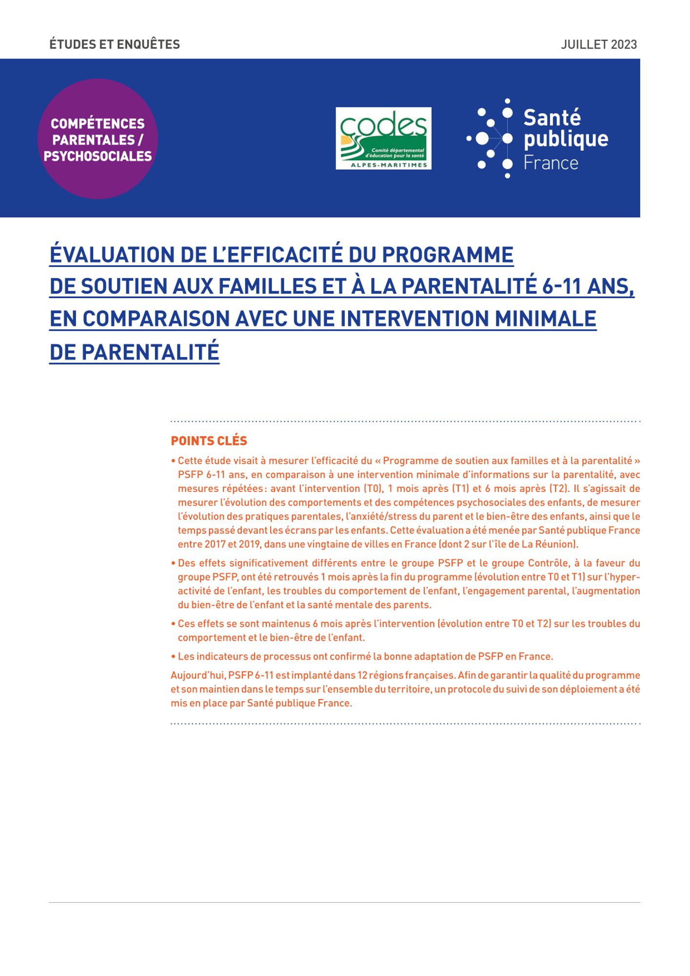 Les résultats ont confirmé des effets positifs sur les troubles du comportement, l’hyperactivité et le bien-être des enfants, l’engagement parental et la santé mentale des parents. Ces résultats permettent à Santé publique France de s’engager dans le soutien de son déploiement sur le territoire.