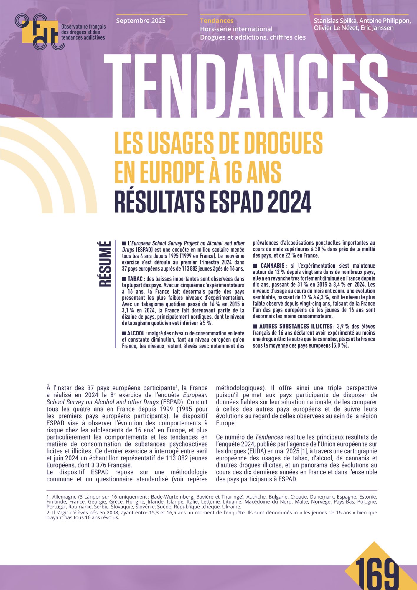Réalisée tous les quatre ans, l’enquête ESPAD vise à suivre les comportements à risque des adolescents de 16 ans en Europe, et plus particulièrement leurs usages de substances psychoactives. L’édition 2024 s’est déroulée entre avril et juin auprès d’un échantillon représentatif de 113 882 jeunes interrogés dans 37 pays, dont 3 376 en France.
