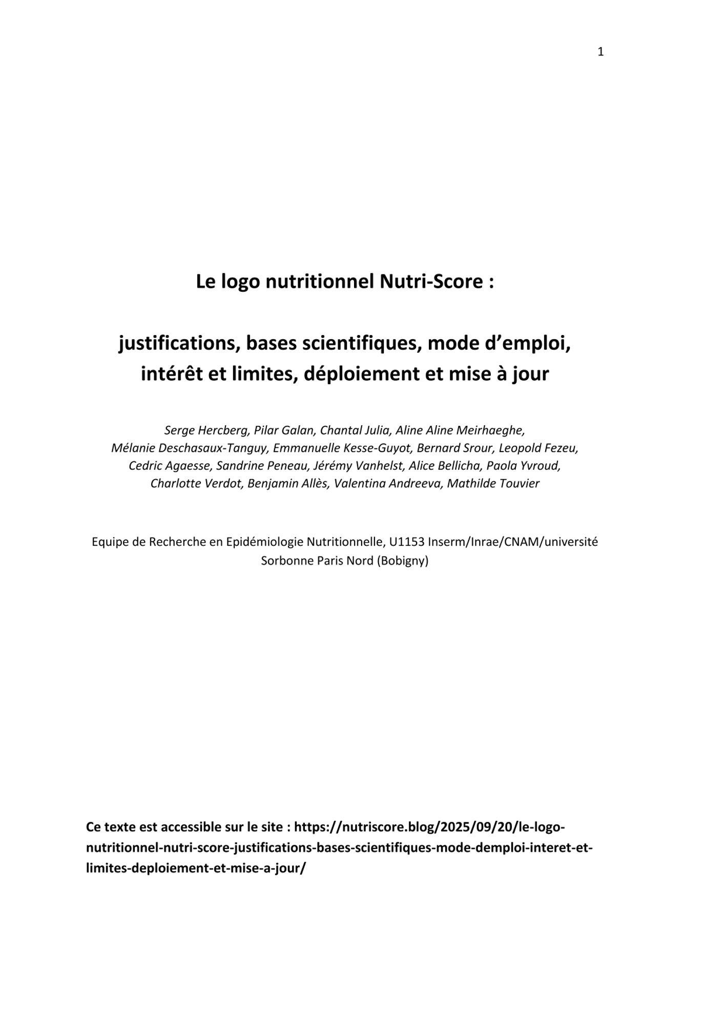 La revue générale scientifique rédigée par les chercheurs de l'Equipe de Recherche en Epidémiologie Nutritionnelle
