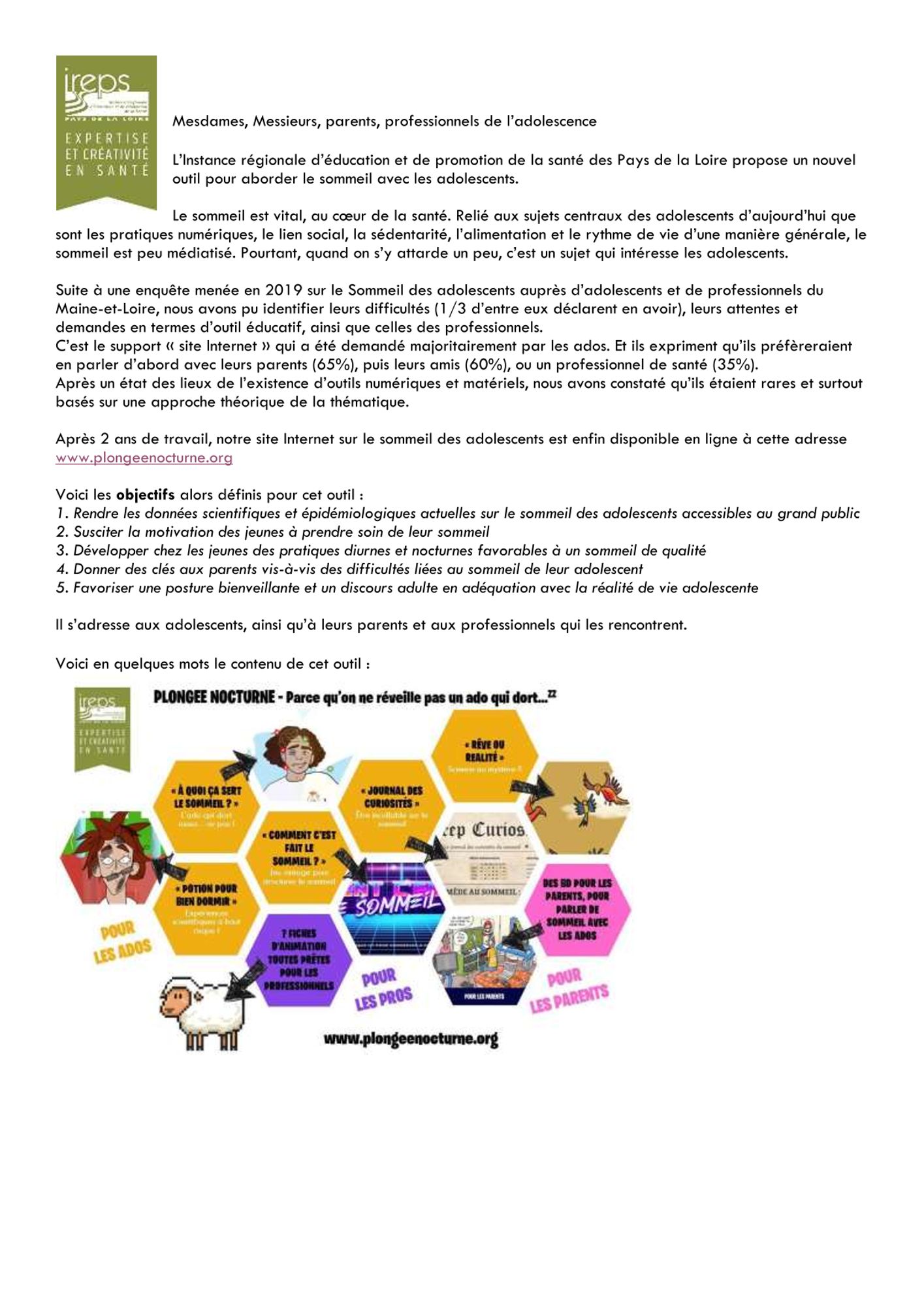 Plongée Nocturne est un site internet de l'Ireps Pays de la Loire dont l’objectif est de promouvoir des environnements et des comportements favorables au sommeil à destination des adolescents à travers des infos, jeux, vidéos… mais aussi des fiches pédagogiques pour les professionnels et des conseils pour les parents.