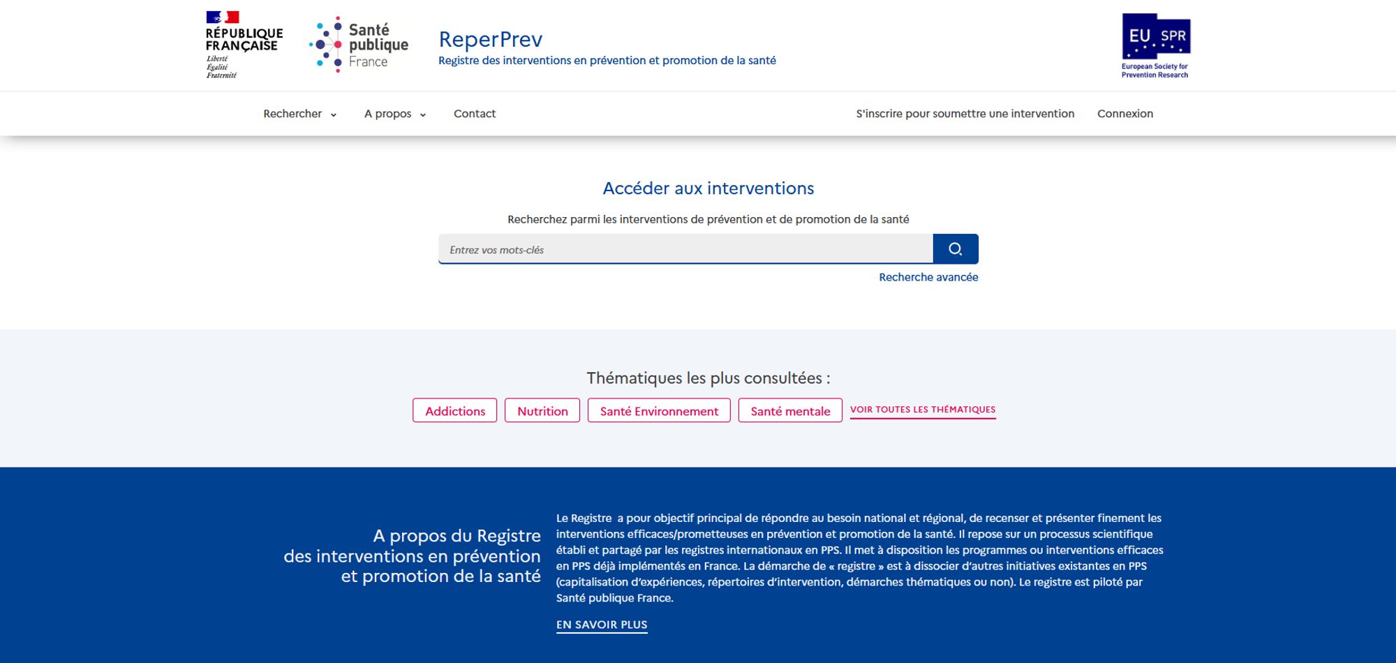 L'objectif du Registre ReperPrev est de répondre au besoin national et régional, de recenser et présenter les interventions en prévention et promotion de la santé évaluées scientifiquement. Il permet de faciliter l’implémentation d’interventions pour augmenter l’efficacité et l’équité des dispositifs locaux de prévention et promotion de la santé à une échelle nationale.