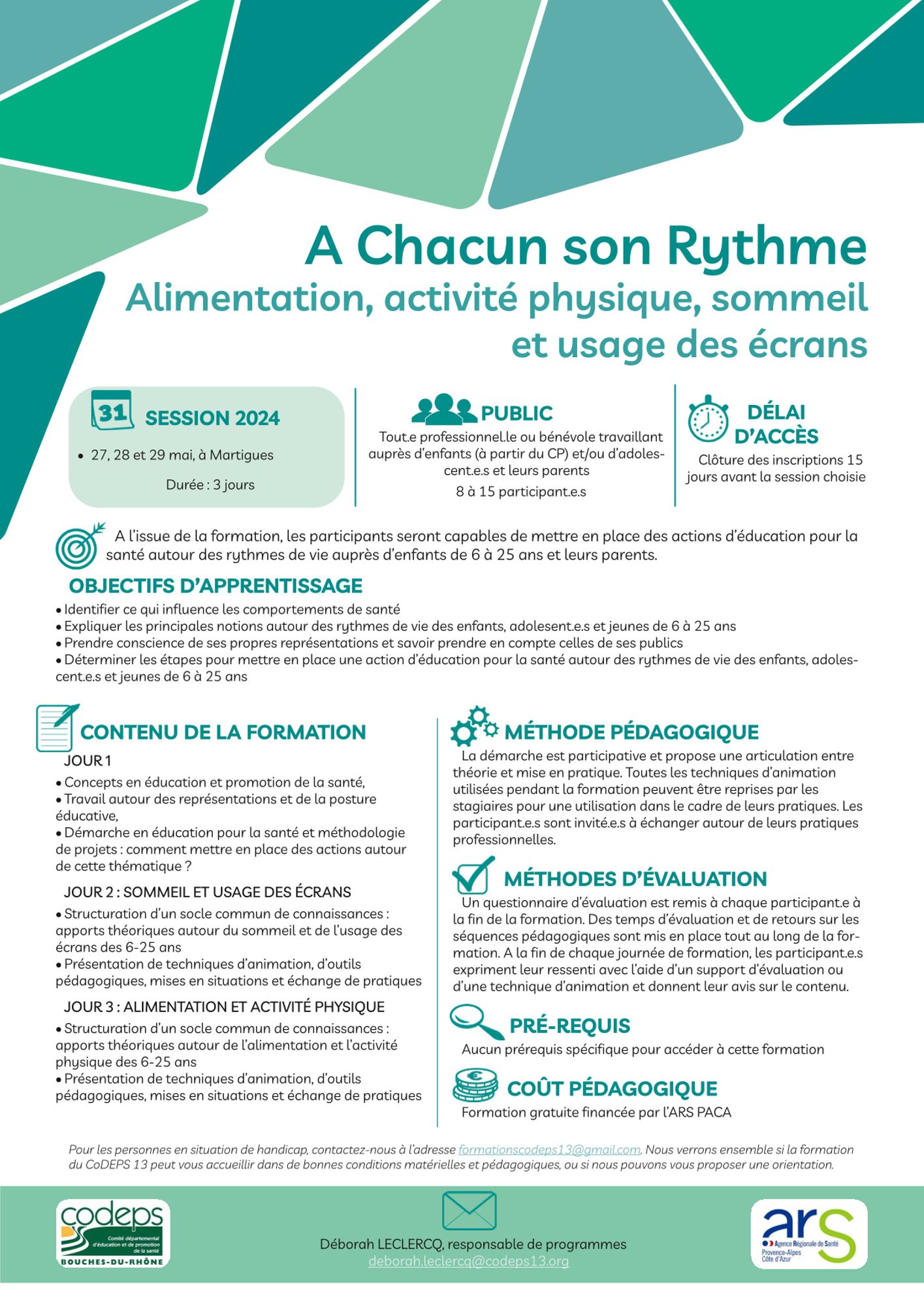 - Découvrir les bases de la démarche, de la posture et de la méthodologie en éducation pour la santé afin de mettre en place des actions autour des rythmes de vie (alimentation, activité physique, sommeil, écrans)