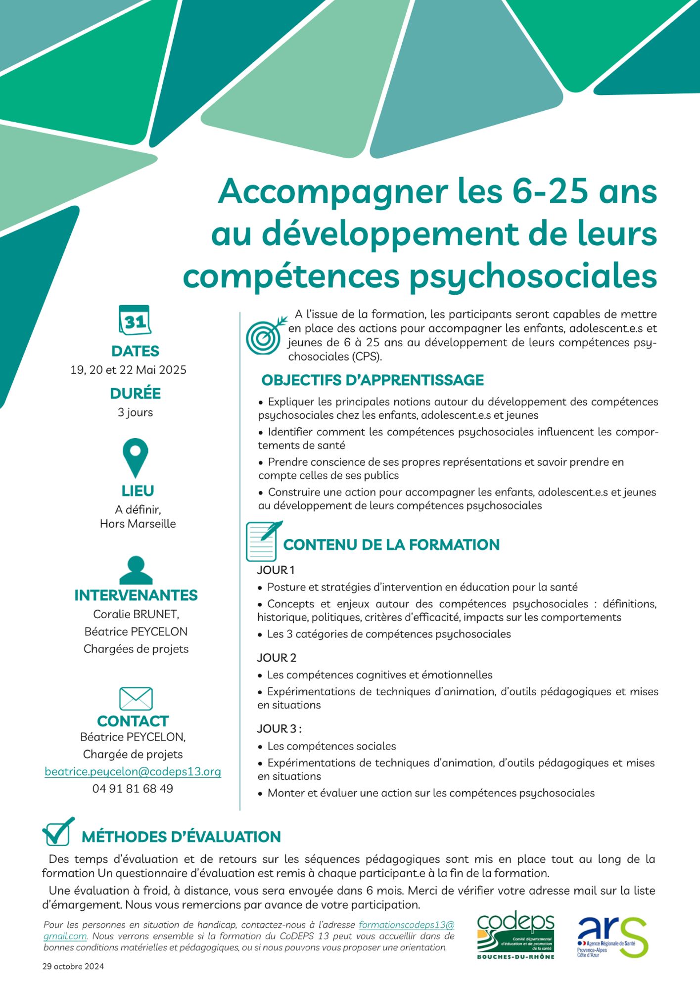 - Déterminer les étapes pour mettre en place une action d’éducation pour la santé autour des comptences psychosociales des enfants, adolescent.e.s et jeunes de 6 à 25 ans.