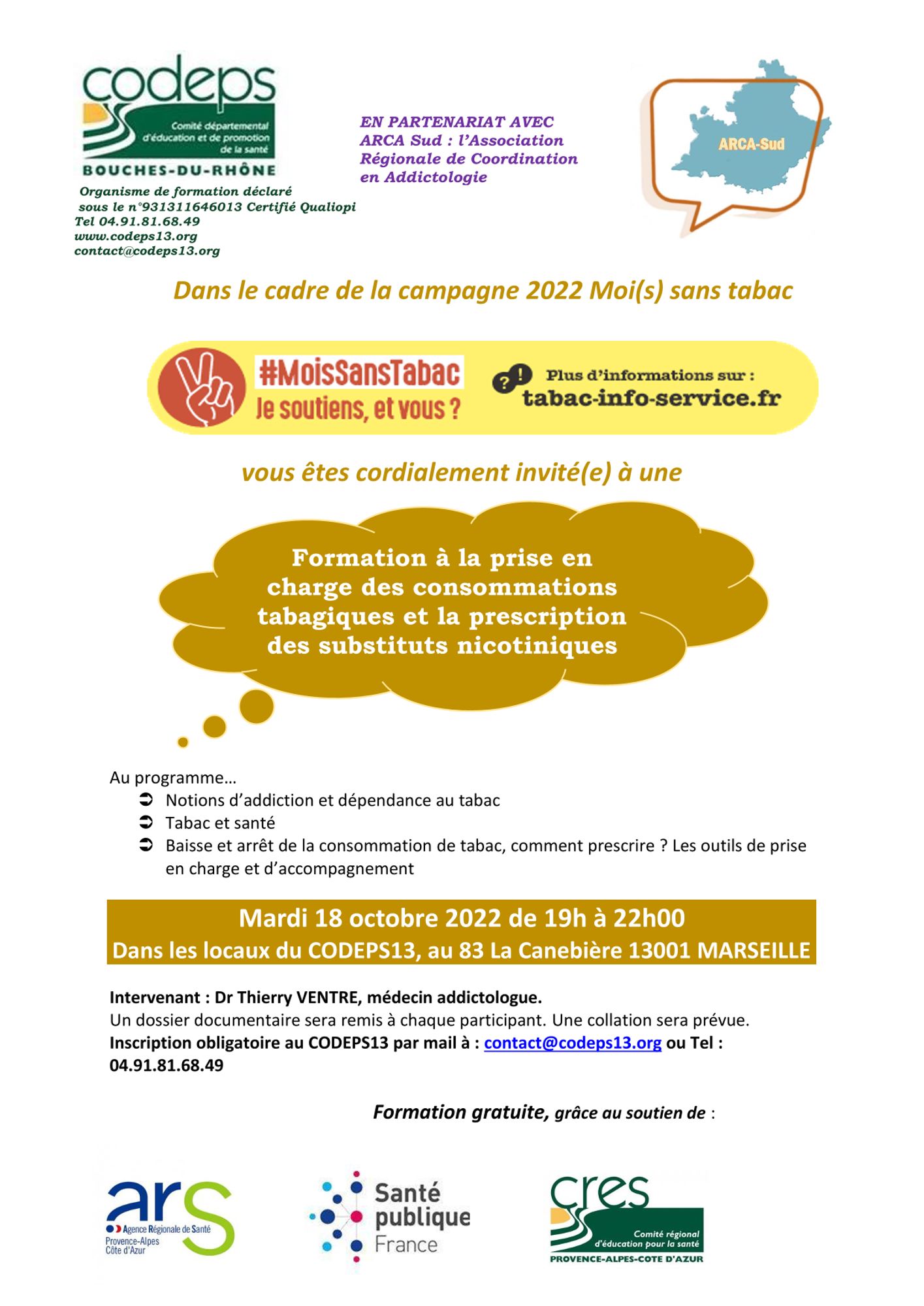Dans le cadre du Moi(s) sans tabac 2022, le CoDEPS13 s'associe avec Arca Sud (Association Régionale de Coordination en Addictologie) pour proposer une formation sur la prescription des substituts nicotiniques.