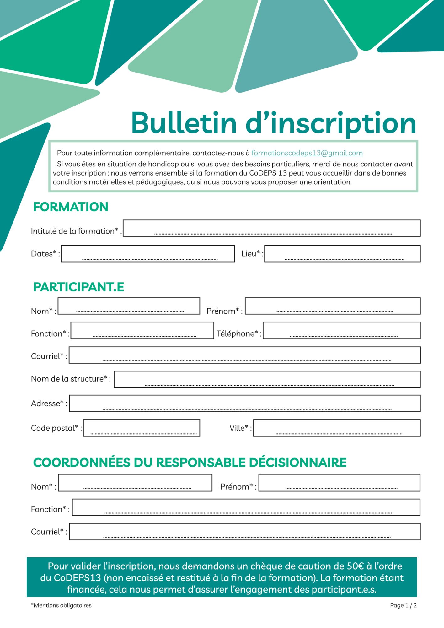Un chèque de caution de 50€ est demandé pour réserver sa place, qui sera rendu à l’issue de la formation. La prise en compte des inscriptions sera définitive une fois le chèque de caution reçu. La présence aux 3 jours de formation est obligatoire pour obtenir une attestation de formation.