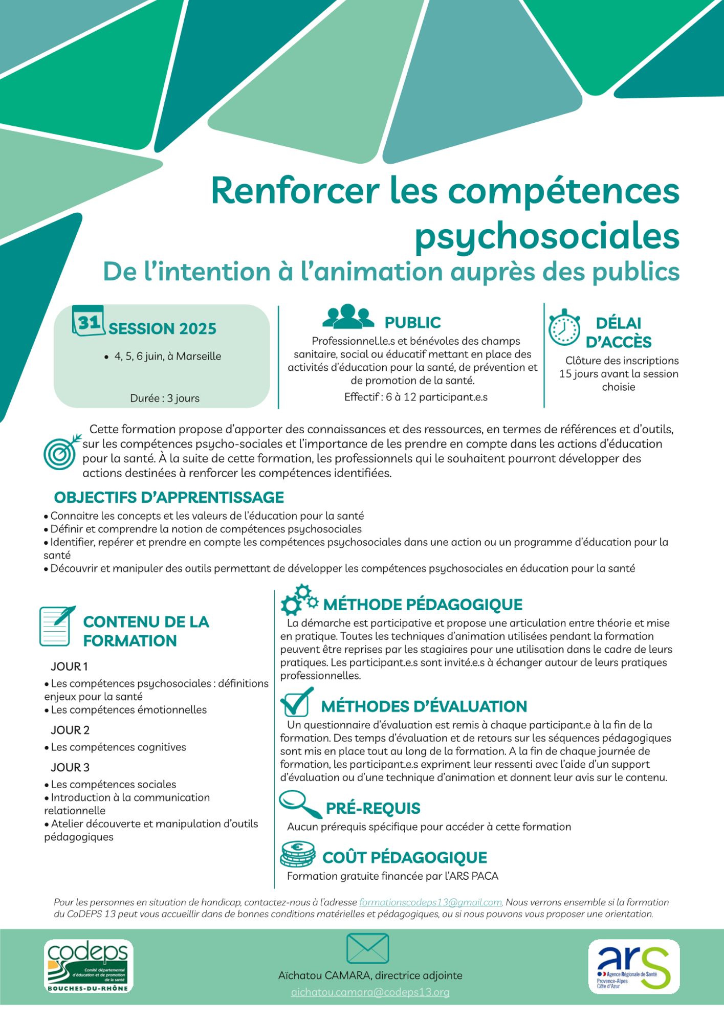 La formation, financée par l'ARS PACA dans le cadre du Dispositif régional de soutien (DRS-PI-PPS), n’engage pas de frais pour les participant.e.s. Un chèque de caution de 50€ est demandé pour réserver sa place, qui sera rendu à l’issue de la formation. La prise en compte des inscriptions sera définitive une fois le chèque de caution reçu. La présence aux 3 jours de formation est obligatoire pour obtenir une attestation de formation. Les frais de déplacement et de restauration sont à la charge des participant.e.s.