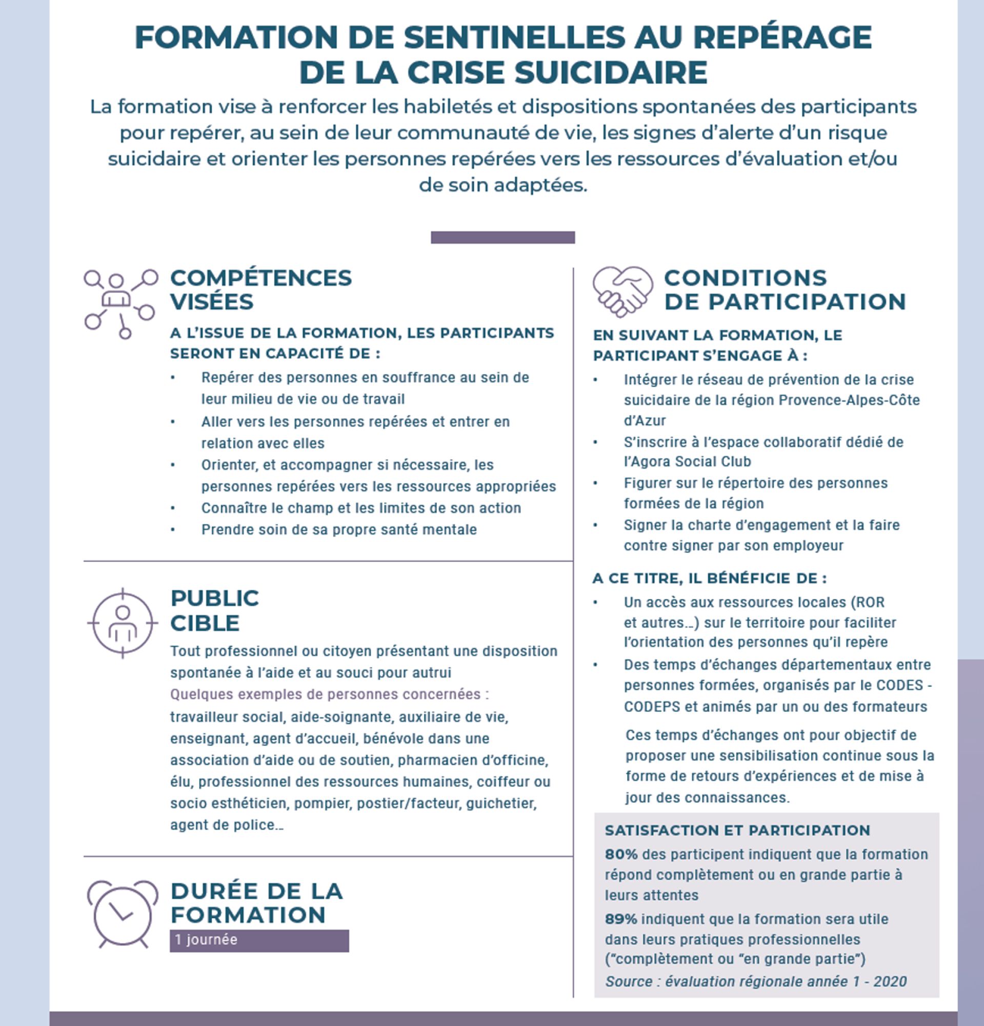 Renforcer les habilités pour repérer les signes de souffrance et les signaux d’alerte d’un risque suicidaire et orienter les personnes repérées vers les ressources d’évaluation et/ou de soins adaptés.