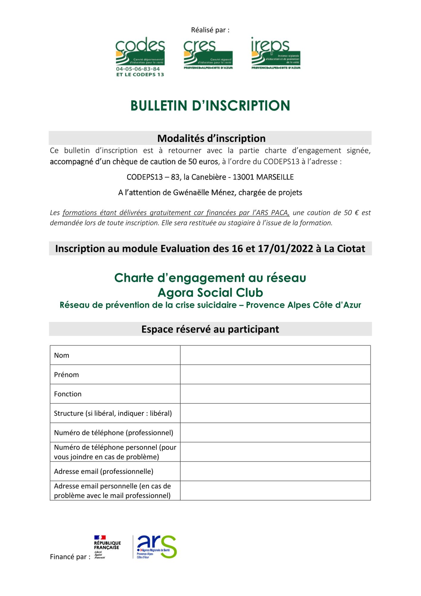 Cette formation, financée par l’Agence régionale de santé (ARS) Provence-Alpes-Côte d’Azur, n'engage pas de frais pour le participant. Un chèque de caution de 50€ est demandé pour réserver sa place, qui sera rendu à l’issue de la formation. Le bulletin d'inscription accompagné de la charte d'engagement signée est à retourner à :
