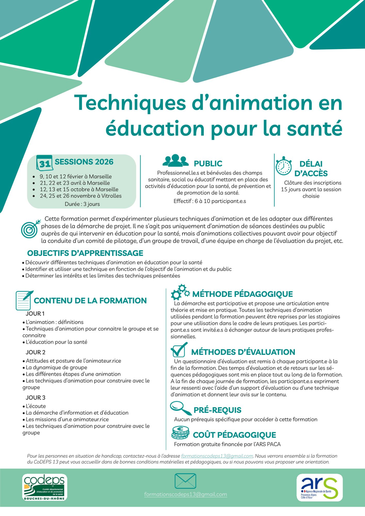La formation, financée par l'ARS PACA, n’engage pas de frais pour les stagiaires. Un chèque de caution de 50€ est demandé pour réserver sa place, qui sera rendu à l’issue de la formation. La prise en compte des inscriptions sera définitive une fois le chèque de caution reçu. La présence aux 3 jours de formation est obligatoire pour obtenir une attestation de formation.