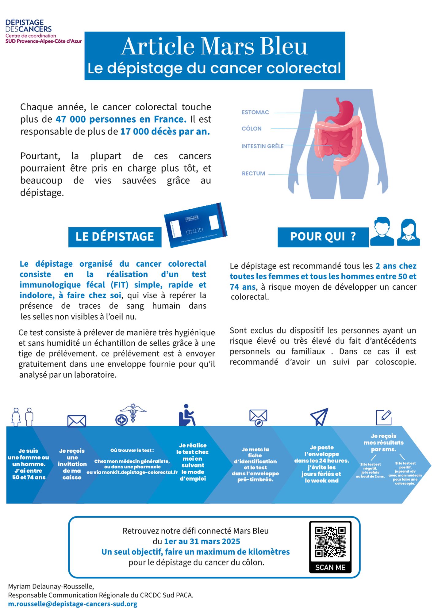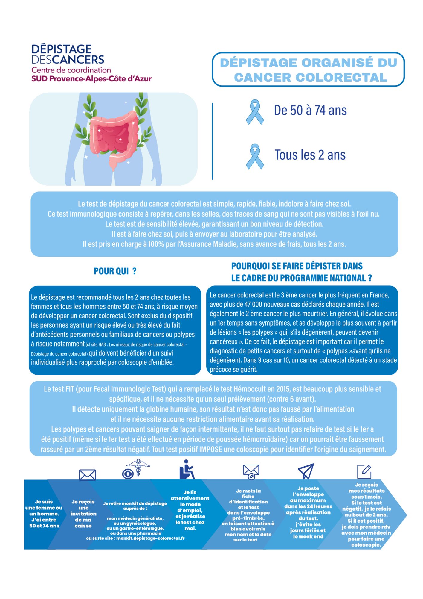 Mars Bleu c’est le mois du cancer colorectal, un cancer qui touche chaque année 47 000 personnes en France. Détectés suffisamment tôt, ils peuvent être guéris dans 9 cas sur 10. Le dépistage est simple, il consiste en la réalisation d'un test FIT simple, indolore, à faire chez soi.