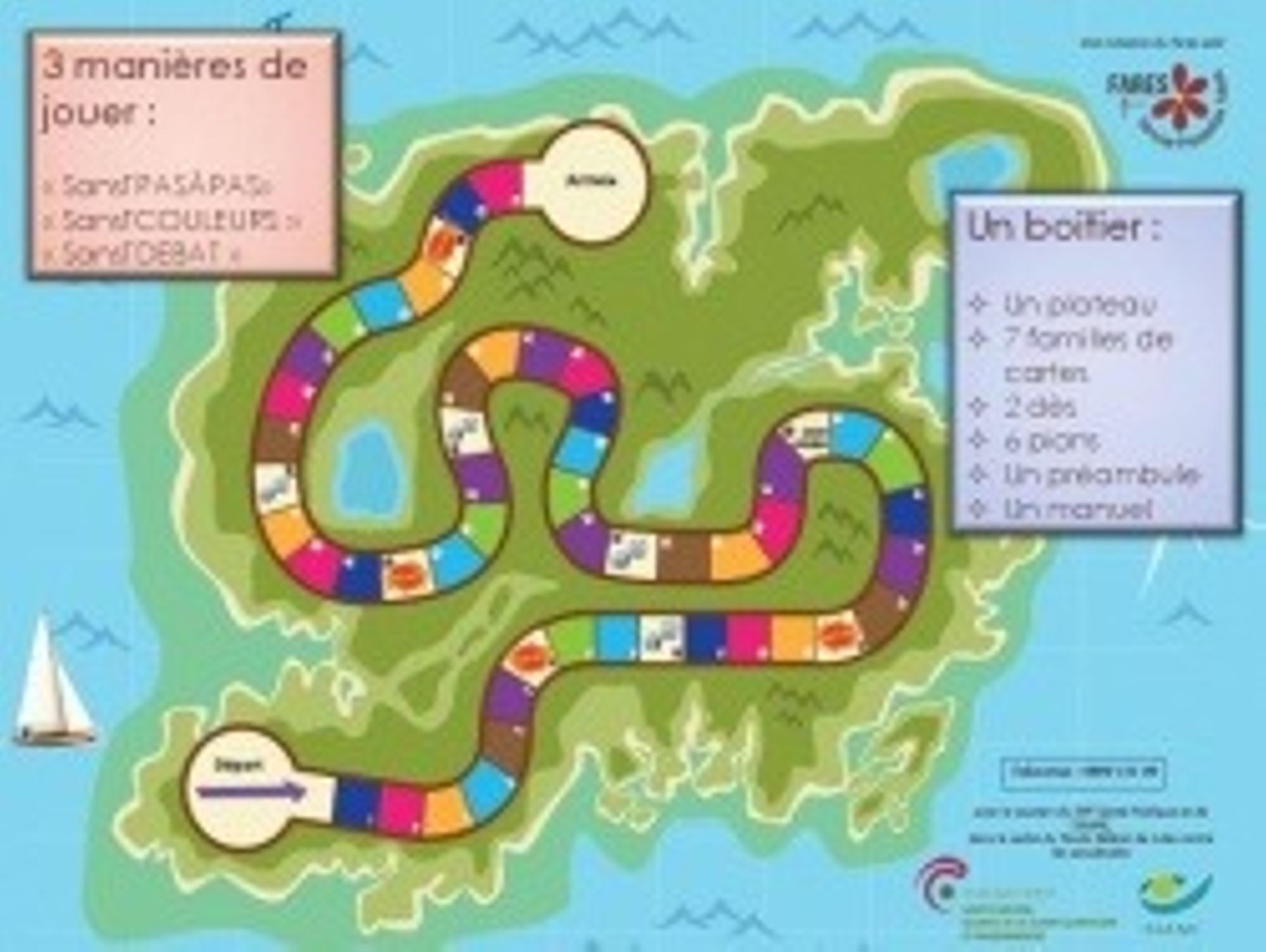 Contenu : Plateau de jeu, 93 cartes à thèmes, 6 pions, 2 dés (1 à chiffres et 1 à faces colorées), un manuel pour l'intervenant, une évaluation post-animation