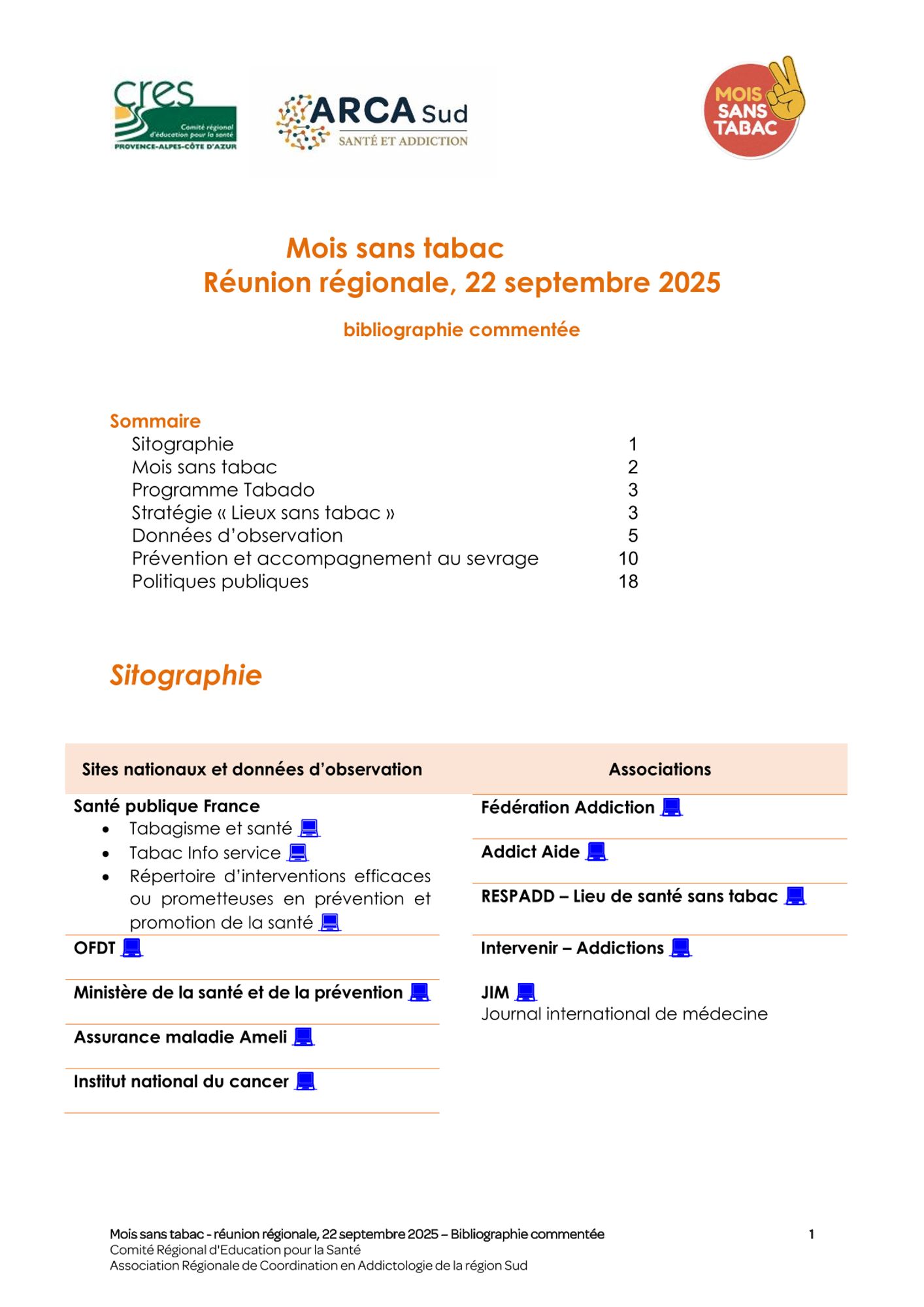 - Une bibliographie commentée, contenant une liste de ressources (articles, revues, vidéos, guides, etc.) pour le Mois sans Tabac, publiée en septembre 2025 ;