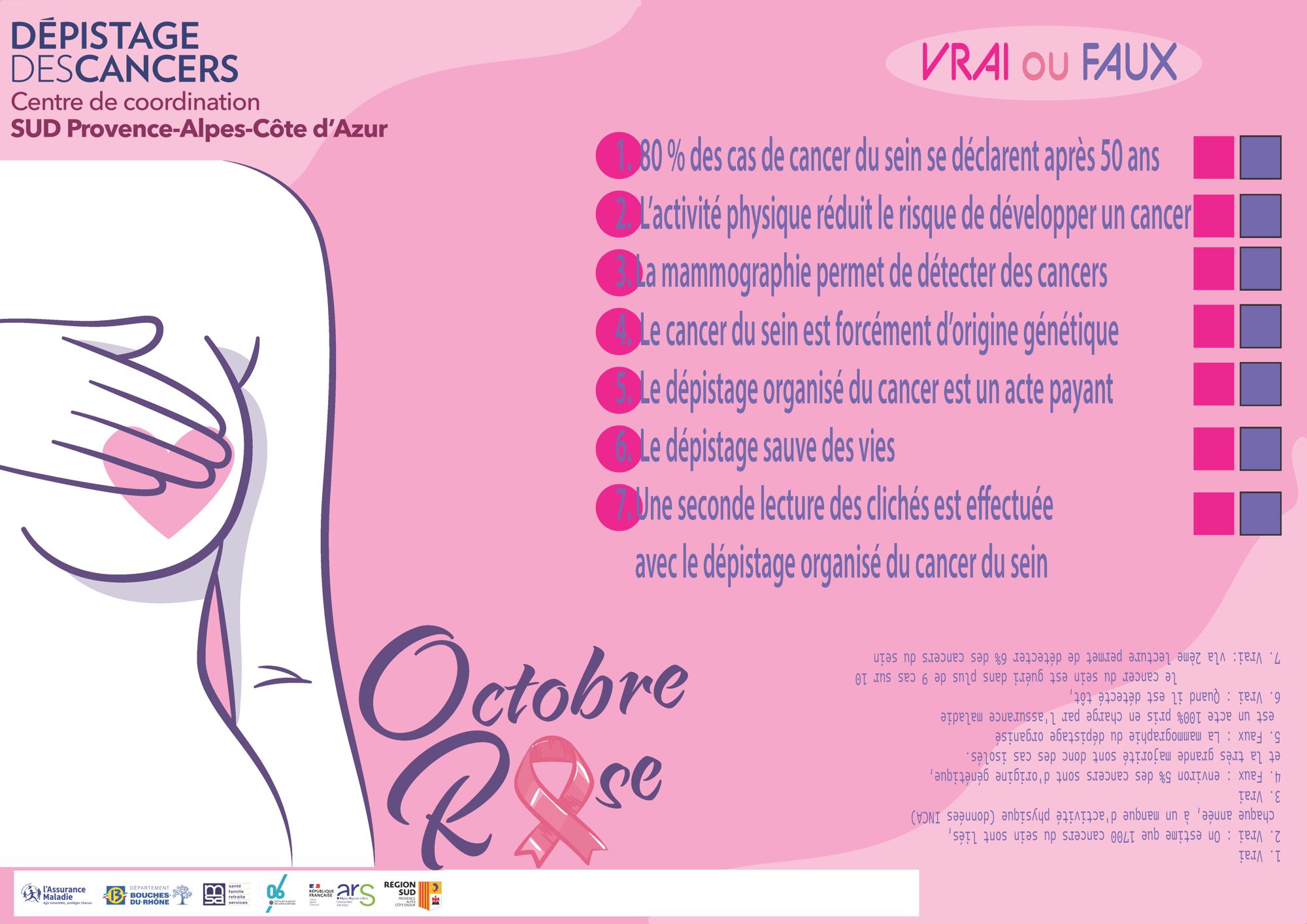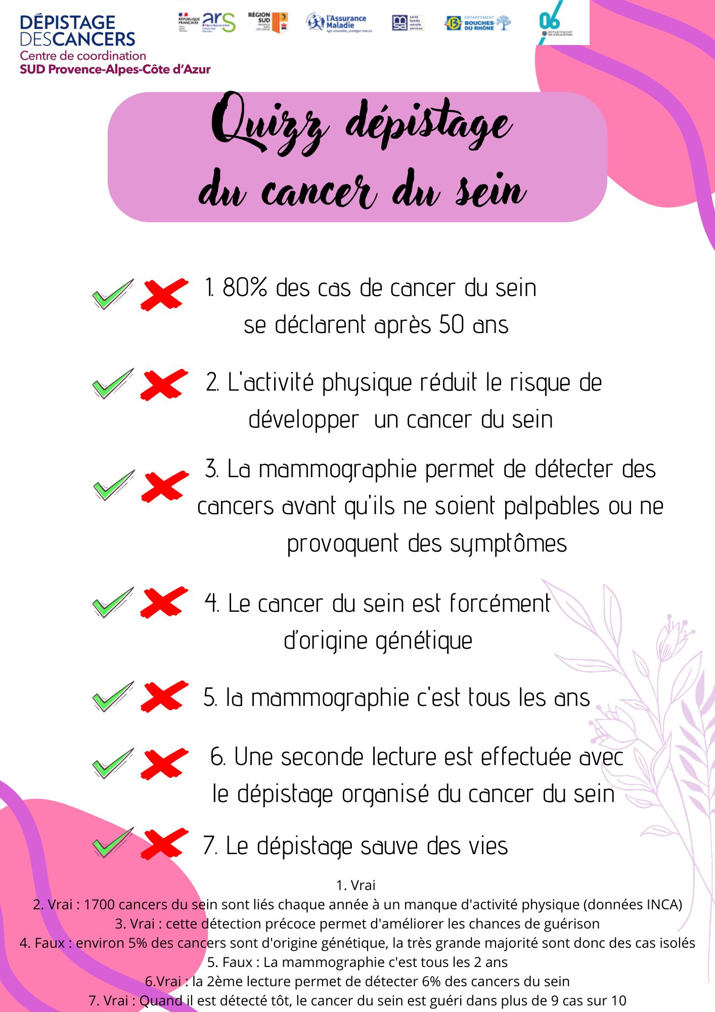 Brochures, affiches et quizz sur le dépistage du cancer du sein Disponibles gratuitement au Pôle ressources du Codeps13 Dernière modification : 10 octobre 2025 Cette documentation à diffuser auprès des publics est disponible gratuitement à notre Pôle ressources (sous réserve de disponibilité des stocks). Prenez rendez-vous pour en récupérer : Contactez le pôle Ressources Brochures et Affiches téléchargeables : Dépistage des cancers du sein. La personne la mieux placée pour vous convaincre, c'est vous. Les cancers du sein en 10 points clés Le dépistage des cancers du sein. Mon guide pratique Dépliant d'information simplifié sur le cancer du sein Affiche sur les dépistages des cancers recommandés Alimentation. Quelle place dans la prévention des cancers? Activité physique. Quels bénéfices contre les cancers ? La prévention des cancers. Agir au quotidien Les cancers gynécologiques Le dépistage des cancers. Comment ? Pour qui ?