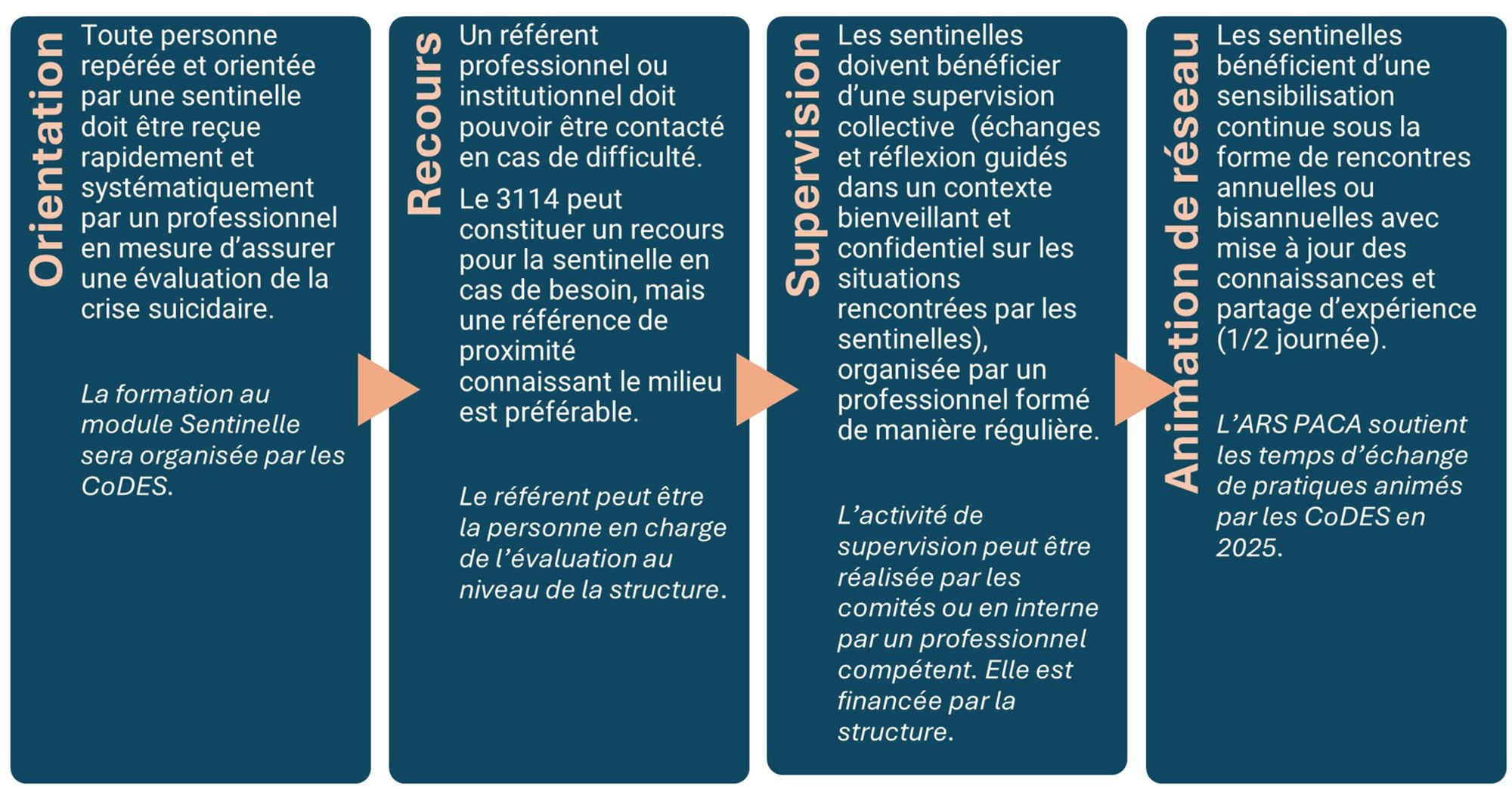 Plus qu’une simple formation, le module Sentinelle participe d’un dispositif de prévention plus large dit « dispositif Sentinelle » : le déploiement d’un réseau d’acteurs volontaires spécialement identifiés, formés et accompagnés.
