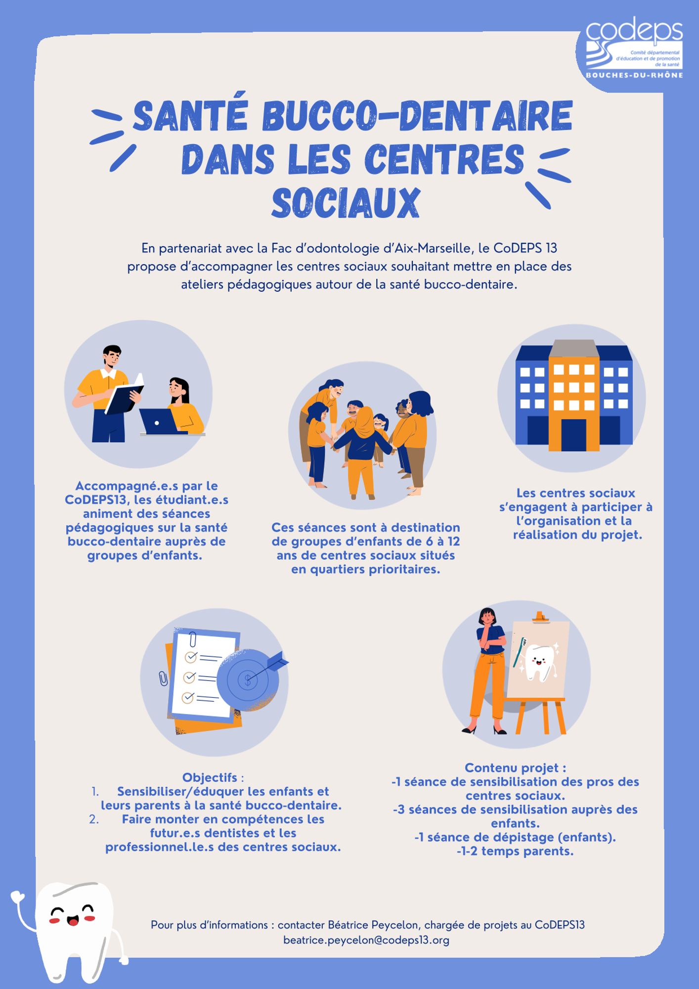 Accompagner les étudiant.e.s de 6ème année dentaires de la faculté d’odontologie d’Aix Marseille Université dans la mise en place d’un projet sur l’hygiène bucco-dentaire dans les centres sociaux.