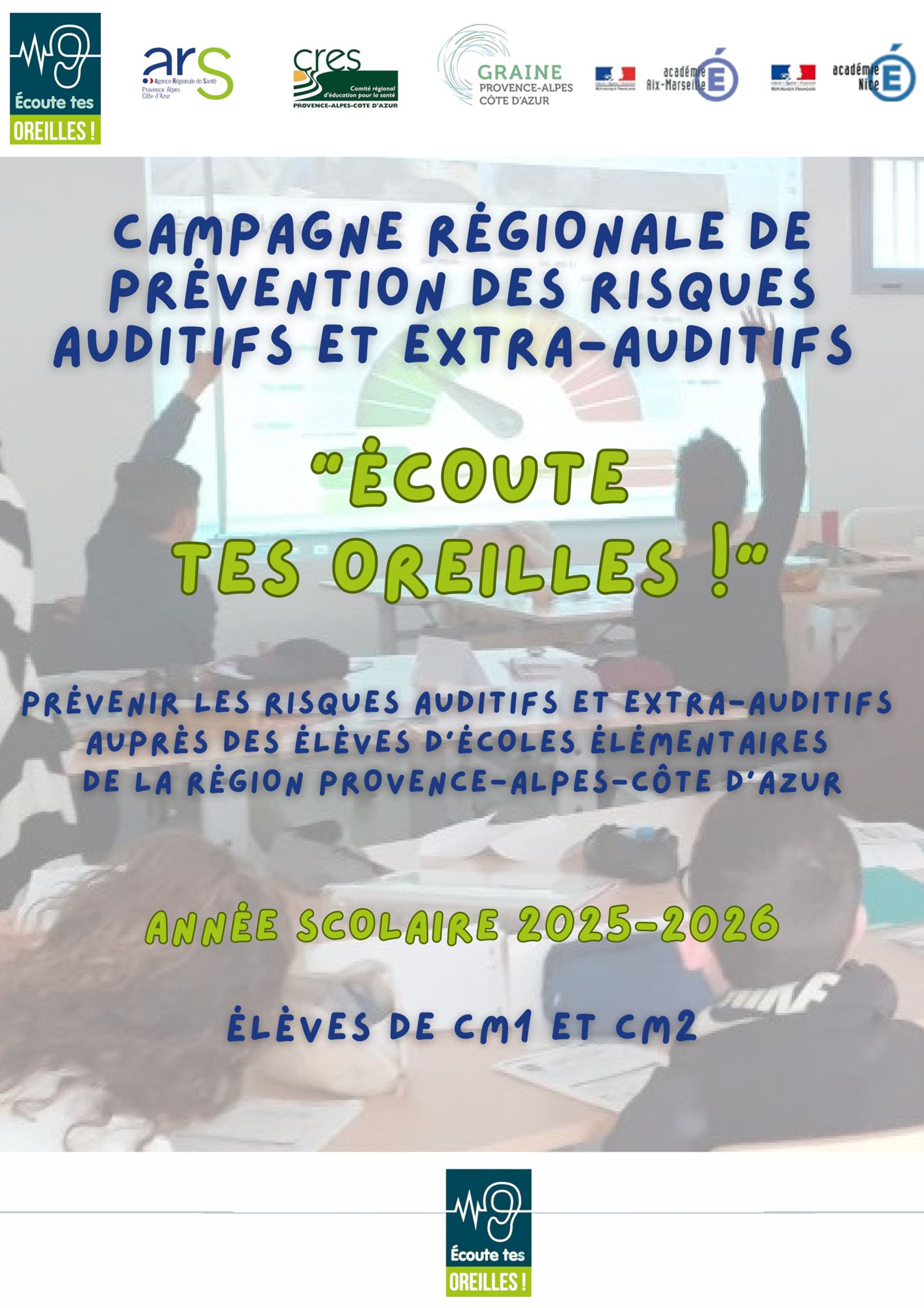Dans ce contexte, le CRES PACA (relayé par les CODES/CoDEPS sur le territoire) et le GRAINE PACA (relayé par les structures de l’éducation à l’environnement et au développement durable (EEDD)) se sont associés pour permettre la création et l’animation d’un module de prévention sur le thème des risques auditifs et extra-auditifs dans les collèges pendant 10 ans. Depuis 2025, la campagne évolue et s'adresse aux écoles élementaires (CM1 et CM2).